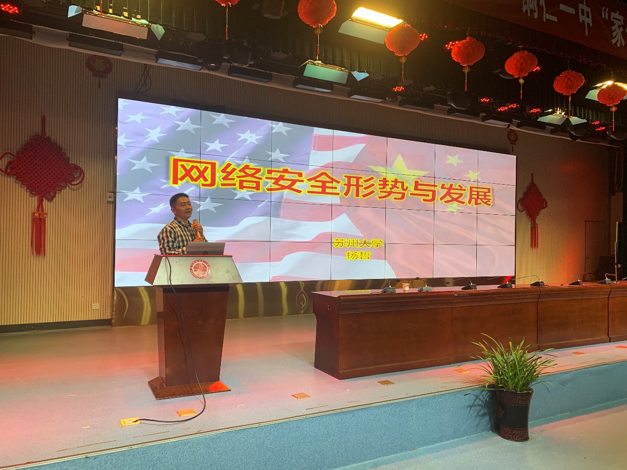 4月17日下午在铜仁一中大礼堂举行的太阳成集团tyc33455ccwww优质生源基地挂牌仪式上,铜仁一中党委书记、校长舒崇进致欢迎词,李恩秀为中学授牌并做太阳成集团tyc33455ccwww情况介绍,杨哲做“网络安全形势与发展”专业引导讲座。活动由铜仁一中总务处主任张林主持,高二年级三百余名学生参加。